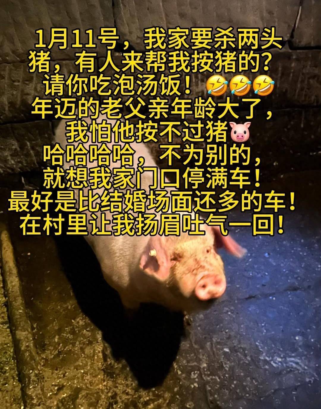 合川呆呆无意间在网上发了一个帖子,内容很简单,家里要杀年猪,父亲年纪大了,她想找几个热心网友帮忙按猪,如果能把家门口的路边停满车,就像结婚一样,让她能够在村里扬眉吐气一下,就更好了。当然了,呆呆也不让大家白帮忙,泡汤饭肯定是要管的。